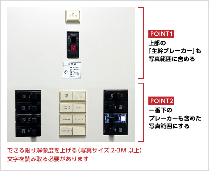 電気工事を依頼する際、事前に分電盤の写真があると、電気工事業者側も見積もり等の対応がしやすくなります。以下のポイントを押さえた写真を撮りましょう。